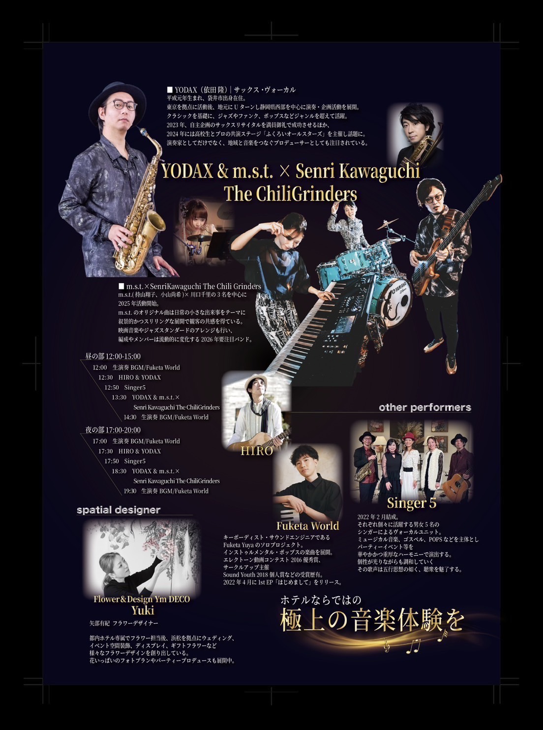 ホテルで極上の音楽を靴を脱ぎ、リラックスしたスタイルでお楽しみ頂ける新しい形のライブを空間演出された会場と共にご堪能ください♪